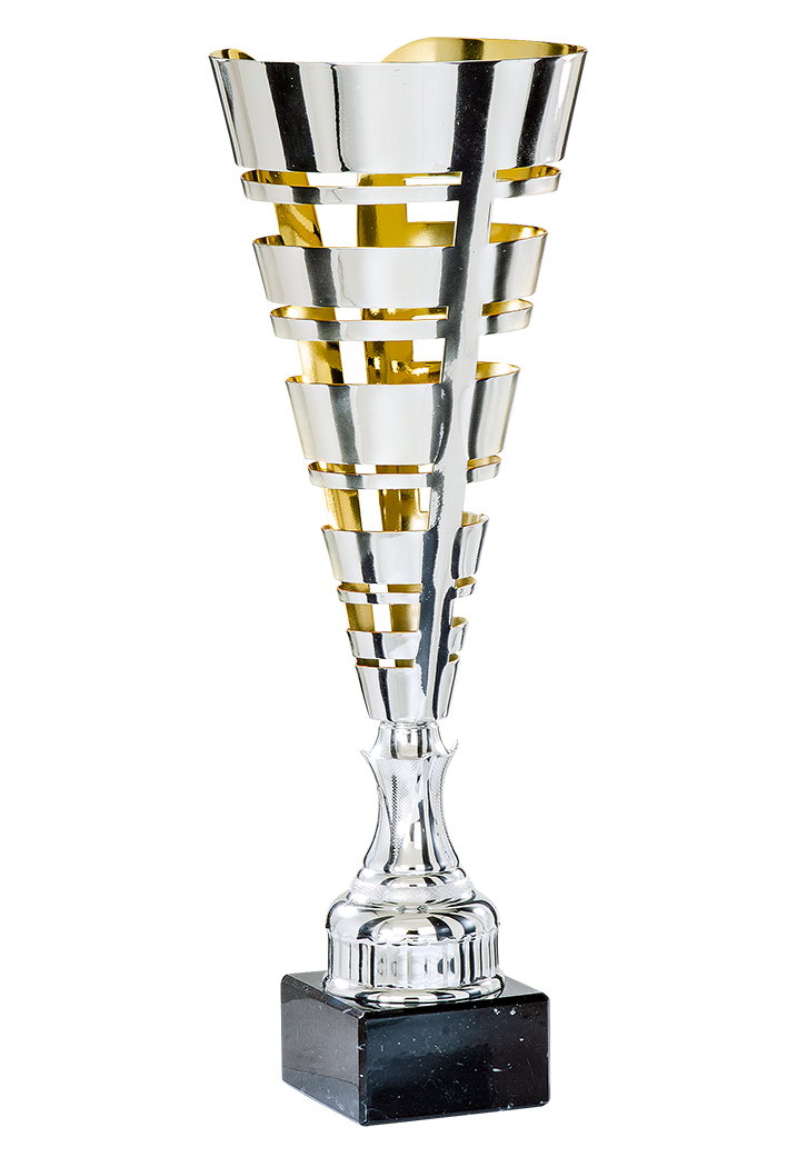 COUPE - 3 Hauteurs : 41cm - 43cm - 44cm - Coupelle laser design en métal - Pied de coupe : ABS métallisé - Base en marbre - Finition : Argent avec intérieur Or