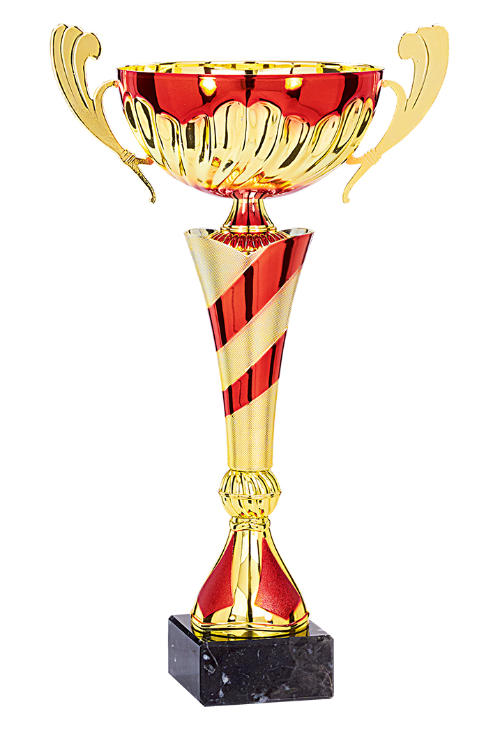 COUPE - 4 Hauteurs : 28cm - 32cm - 35cm - 40cm - Coupelle et anses en métal - Pied & Inter : ABS métallisé - Base en marbre noir - Finition : Or & Rouge