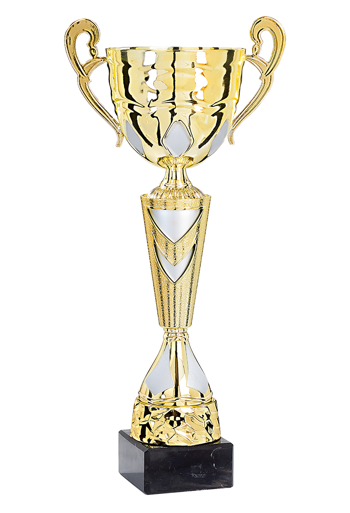 COUPE - 4 Hauteurs : 33cm - 40cm - 46cm - 50cm - Coupelle et anses en métal - Pied & Inter : ABS métallisé - Base en marbre noir - Finition : Or & Bleu