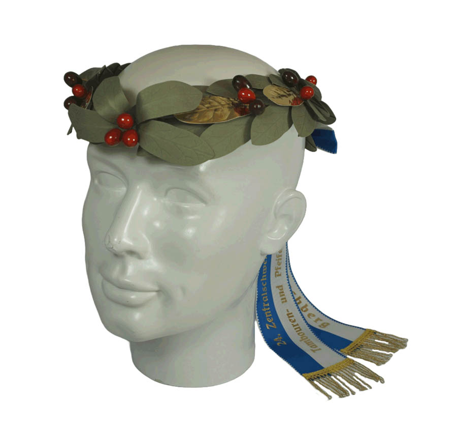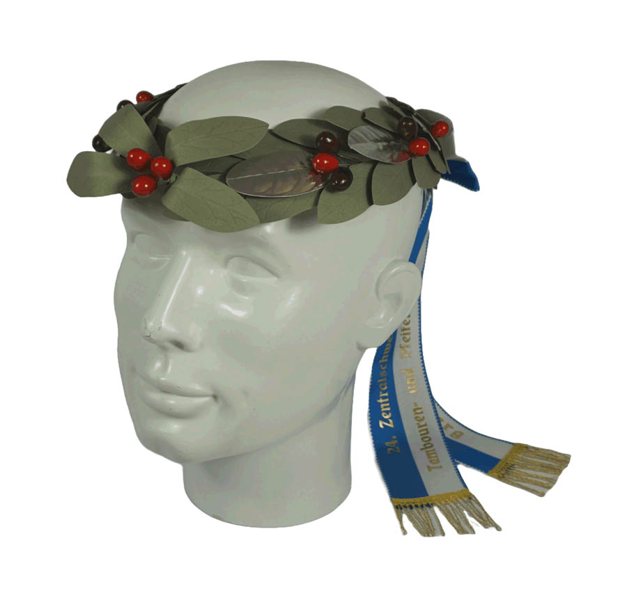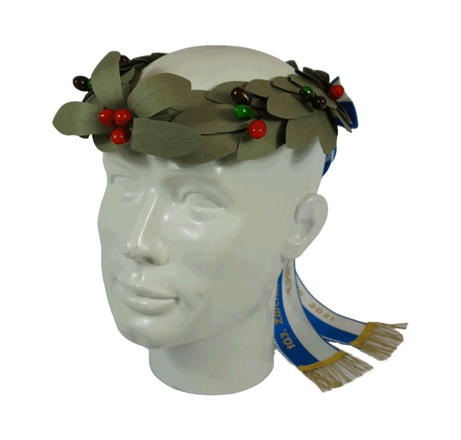 Couronne de tête en olivier, ruban (55 mm) avec impression et franges en or