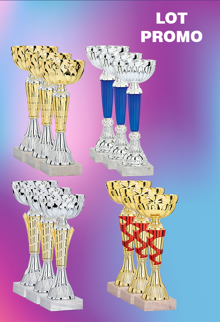 12 COUPES - Hauteur Moyenne : 21 cm - Coupelle en métal - Inter : matière synthétique - Base : marbre blanc - 4 séries de 3 coupes identiques en 3 hauteurs différente