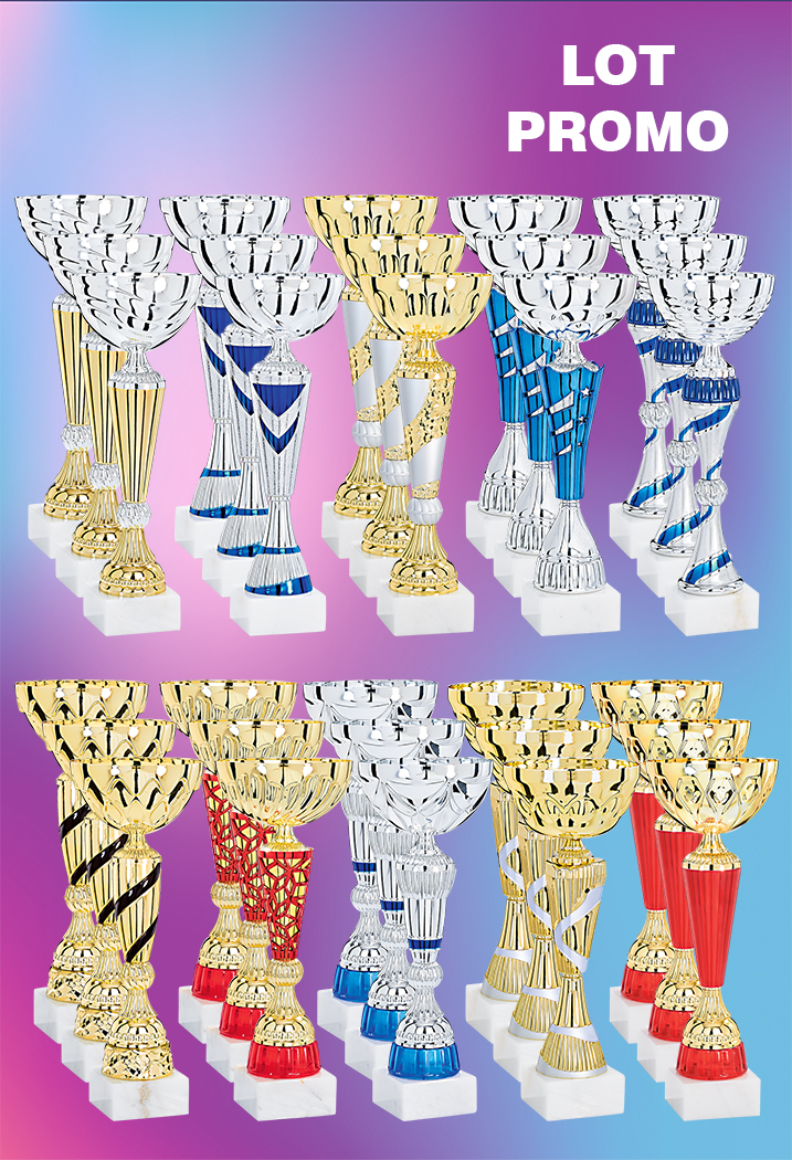 30 COUPES - Hauteur Moyenne : 33,7 cm - Coupelle en métal - Inter : matière synthétique - Base : marbre blanc - 10 séries de 3 coupes identiques en 3 hauteurs différentes