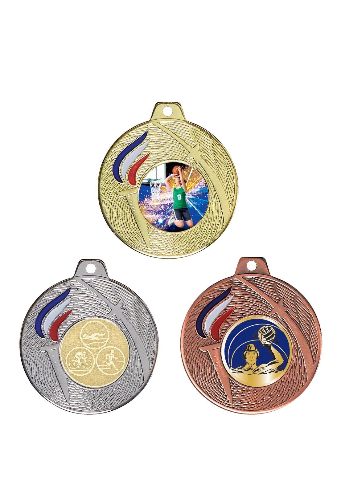 Médaille 50 mm en métal massif émaillé, poids 38 g, épaisseur 2,5 mm, disponible en or, argent ou bronze, avec emplacement pour pastille de 25 mm. Pastille et ruban non inclus.