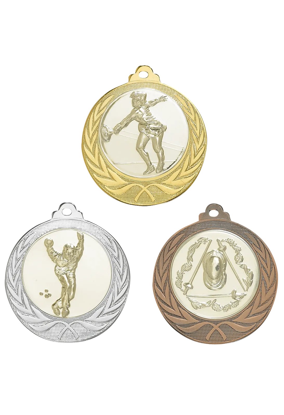 Médaille 70 mm en métal massif, poids 94 g, épaisseur 3 mm, disponible en or, argent ou bronze, avec emplacement pour pastille de 50 mm. Pastille et ruban non inclus.