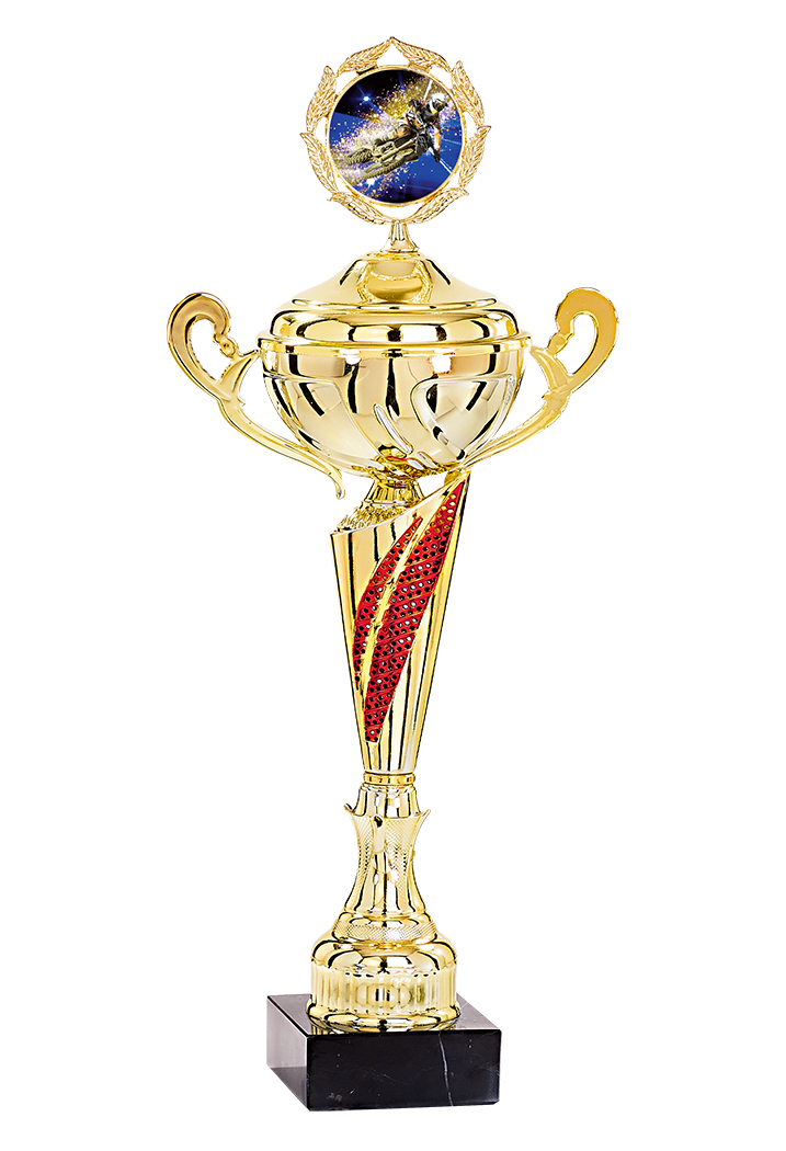 COUPE - 4 Hauteurs : 42cm - 46cm - 49cm - 53cm - Coupelle et anses en métal - Couvercle en métal - Pied & Inter : ABS métallisé - Base en marbre noir - Finition : Or & Rouge - Personnalisation : Choisir votre activité après étape 1 - Grand choix de discip