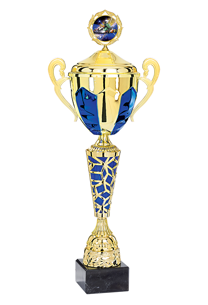 COUPE - 4 Hauteurs : 43cm - 50cm - 56cm - 60cm - Coupelle et anses en métal - Couvercle en métal - Pied & Inter : ABS métallisé - Base en marbre noir - Finition : Or & Bleu - Personnalisation : Choisir votre activité après étape 1 - Grand choix de discipl