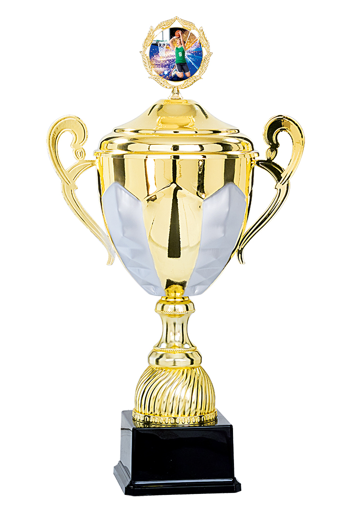 COUPE - 3 Hauteurs : 39cm - 42cm - 46cm - Coupelle avec anses en métal - Couvercle en métal - Inter : ABS - Sous base : ABS métallisé - Base en ABS noir vernis - Finition : Or & Argent Mat - Personnalisation : Choisir votre activité après étape 1 - Grand