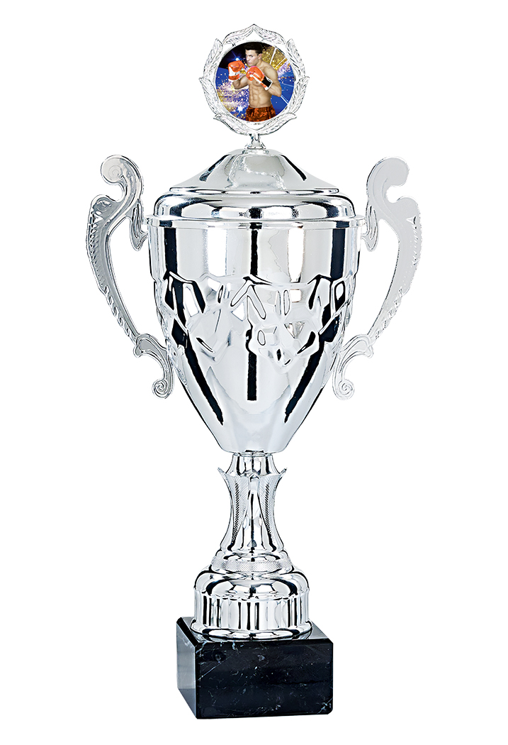 COUPE - 3 Hauteurs : 41cm - 47cm - 50cm - Coupelle et anses en métal - Couvercle en métal - Pied & Inter : ABS métallisé - Base en marbre noir - Finition :Argent & Or - Personnalisation : Choisir votre activité après étape 1 - Figurine synthétique dorée