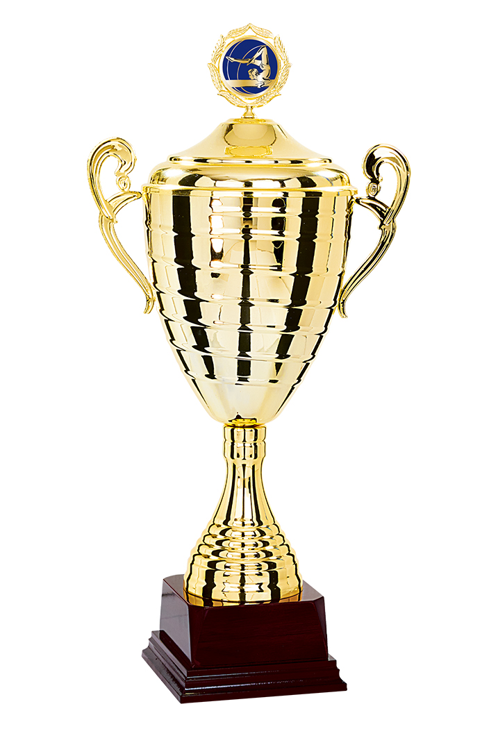 COUPE - 4 Hauteurs : 51cm -56cm - 58cm - 64cm - Coupelle et anses en métal - Couvercle en métal - Pied de coupe en métal - Base : Bois vernis - Finition : Tout Or - Personnalisation : Choisir votre activité après étape 1 - Grand choix de disciplines dispo