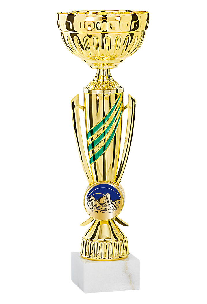 COUPE -1 Hauteurs : 35cm - Coupelle en métal - Pied & Inter : ABS métallisé - Base en marbre - Finition : Or & Vert - Personnalisation : Choisir votre activité après étape 1 - Grand choix de disciplines disponibles - Pastille Ø 50mm : collée sans suppléme
